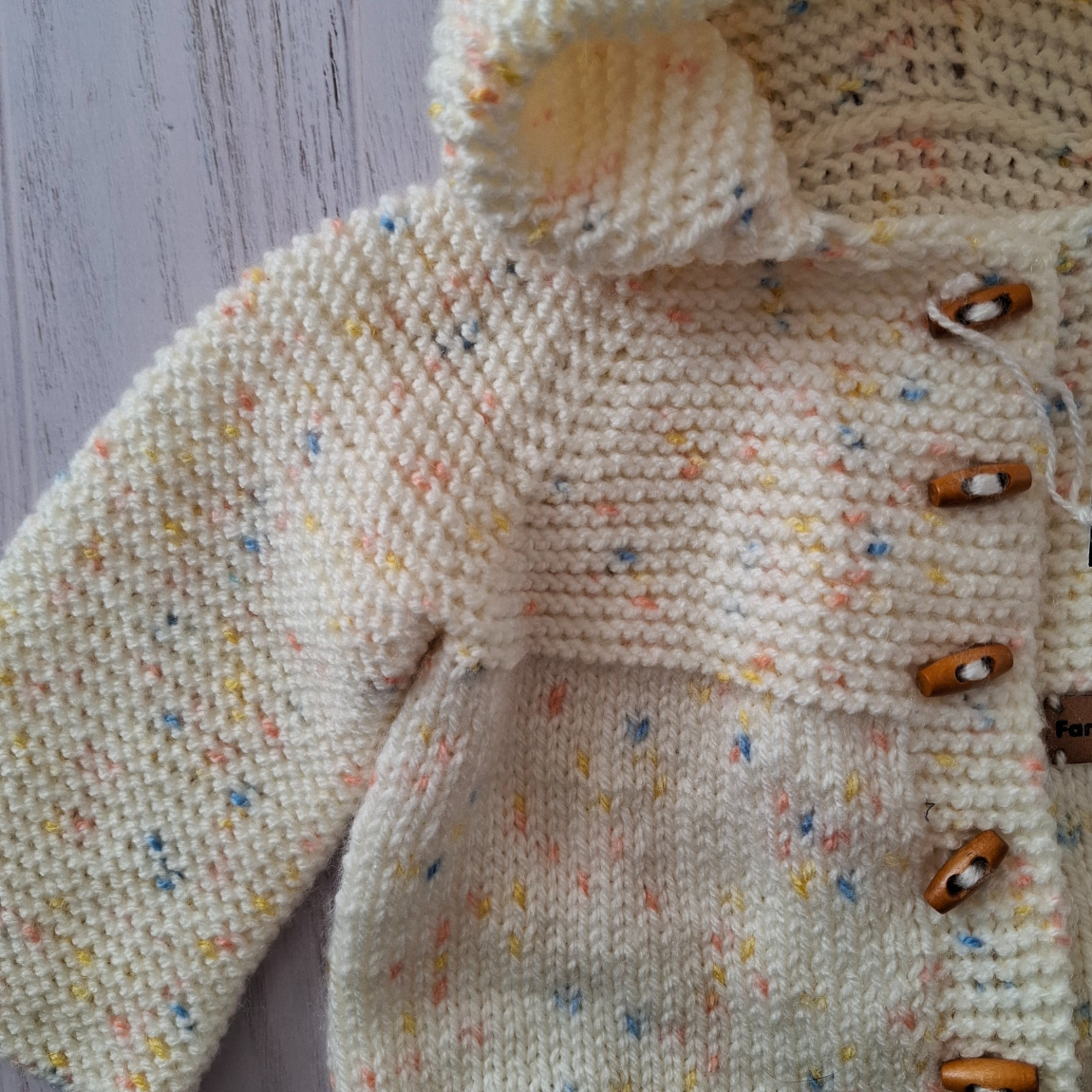 Protección, suavidad y encanto en cada punto. Este abrigo tejido a mano está diseñado para mantener a tu bebé abrigado y cómodo durante los días más frescos. Confeccionado en hilado moteado color crema con detalles en tonos pastel, su textura suave y su calce holgado permiten libertad de movimiento y abrigo natural.