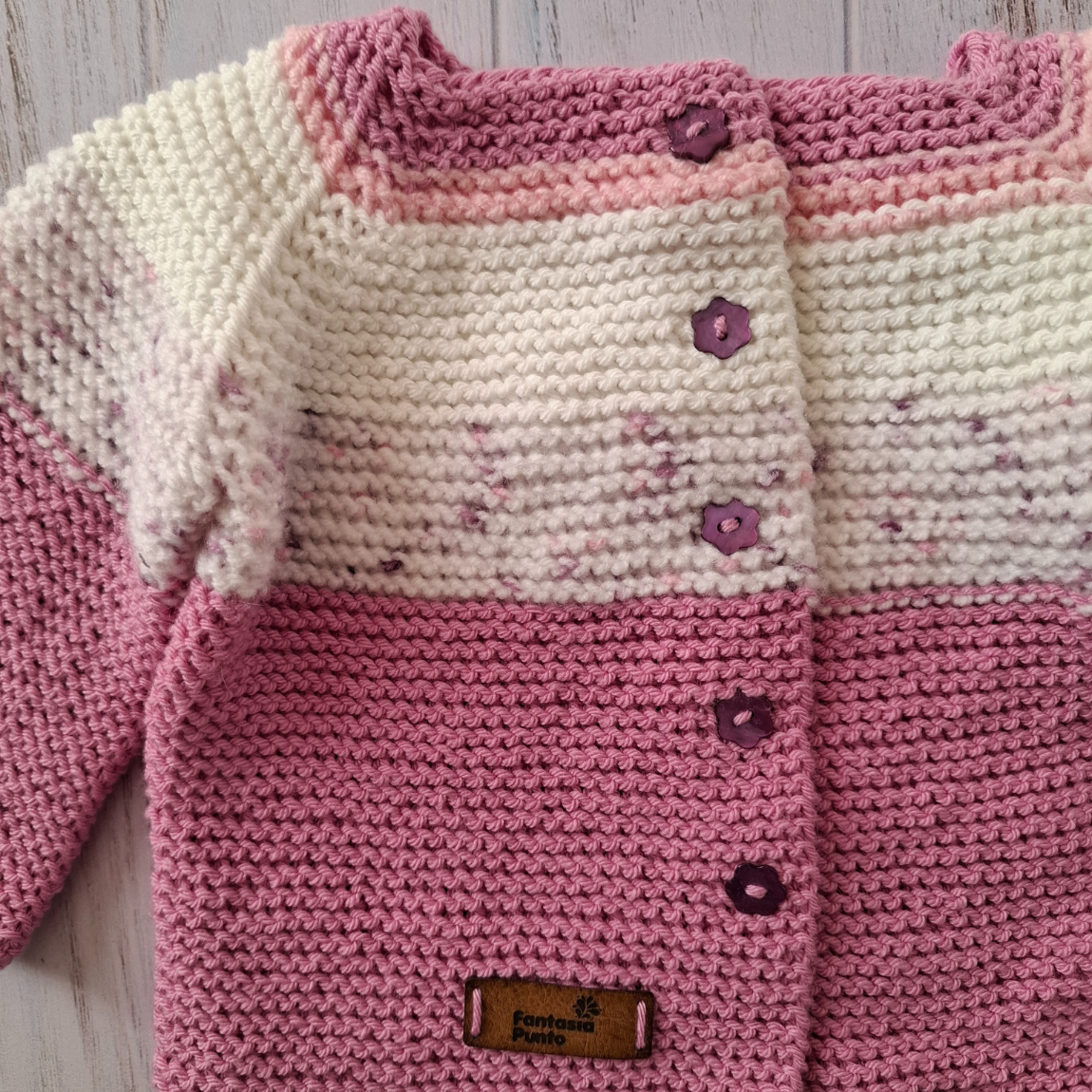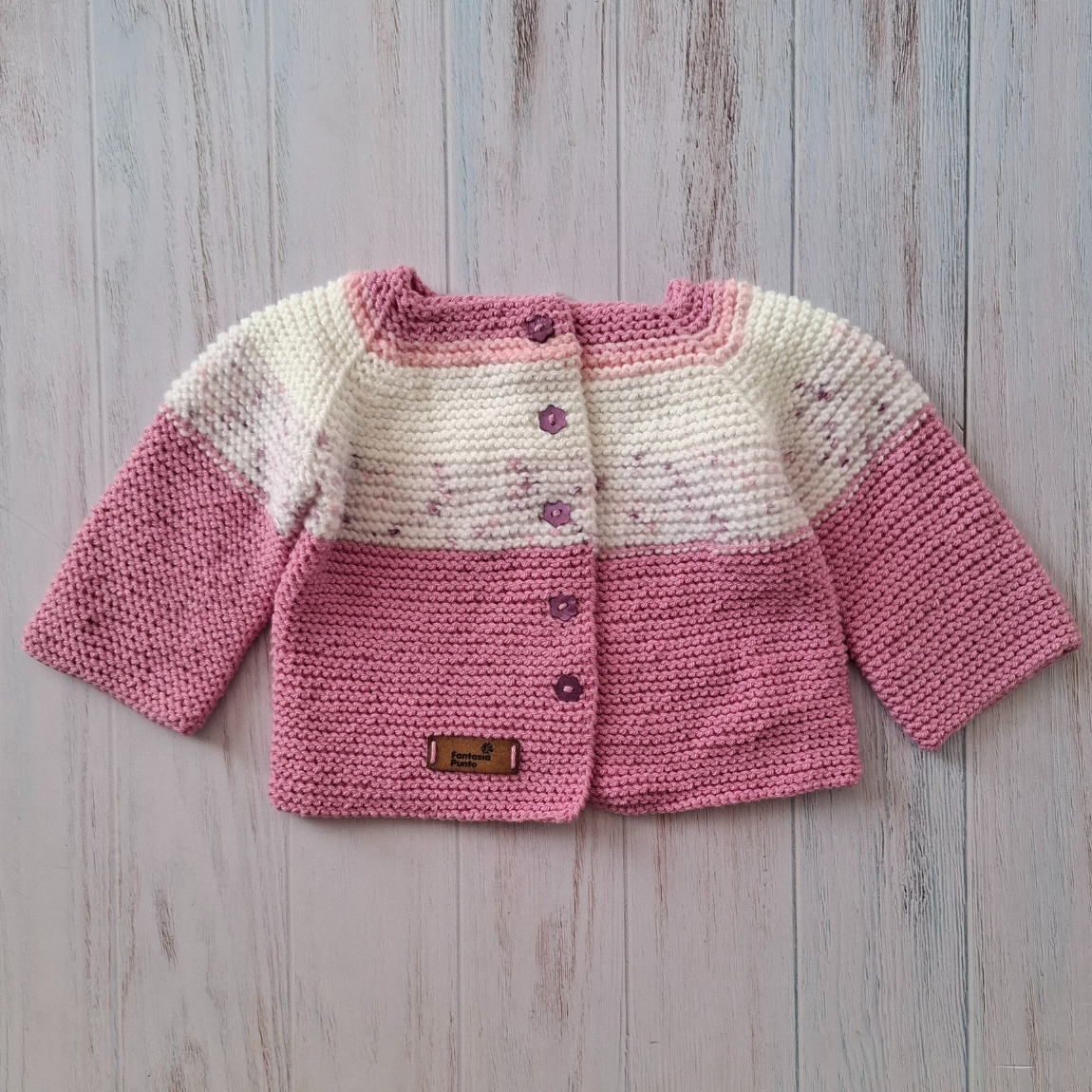 Chaleco tejido a mano en suaves tonos rosados y crema moteado, ideal para mantener a tu bebé abrigado sin perder estilo. Su diseño de dos bloques de color y detalles en botones florales lo convierten en una prenda especial, pensada para regalar o acompañar los primeros paseos del día.
