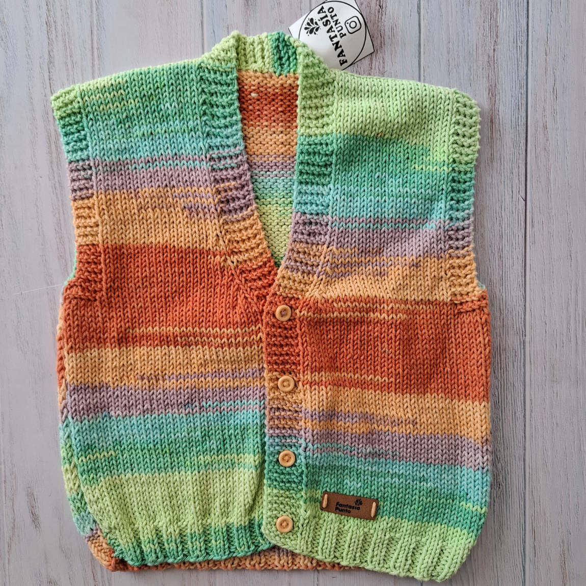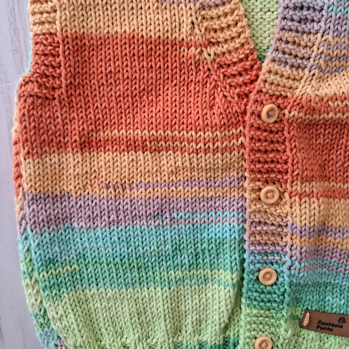 Chaleco tejido a mano en hilo multicolor con efecto arcoíris, perfecto para acompañar los días activos de niños y niñas. Su diseño sin mangas permite libertad de movimiento, ideal para usar sobre poleras o camisas, manteniendo el cuerpo abrigado sin sobrecalentar.