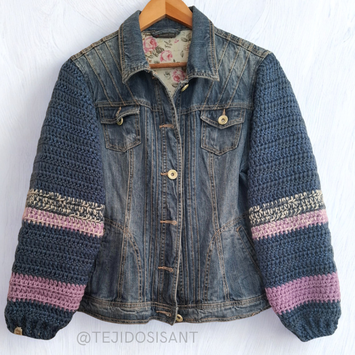 Chaqueta de mezclilla recuperada e intervenida con mangas tejidas a crochet, transformada en una prenda única y sostenible. Cada manga ha sido elaborada a mano con lana merino en tono azul marino, combinada con acentos lilas y detalles con brillo, que aportan luz y textura al diseño.