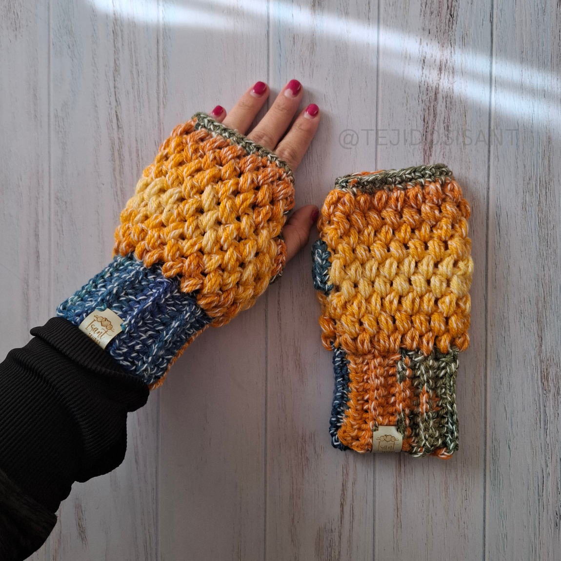 Teñidos en tonos cálidos como el amanecer: amarillo, naranjo y azul profundo se fusionan para abrigar tus manos con energía y color.