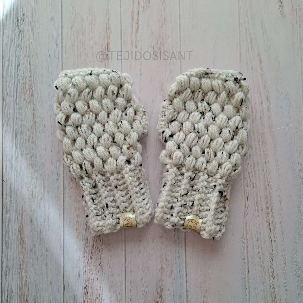 Elegancia y calidez en su versión más natural. Estos mitones en tono crudo con delicadas motas negras evocan la suavidad de una nevada entre árboles.